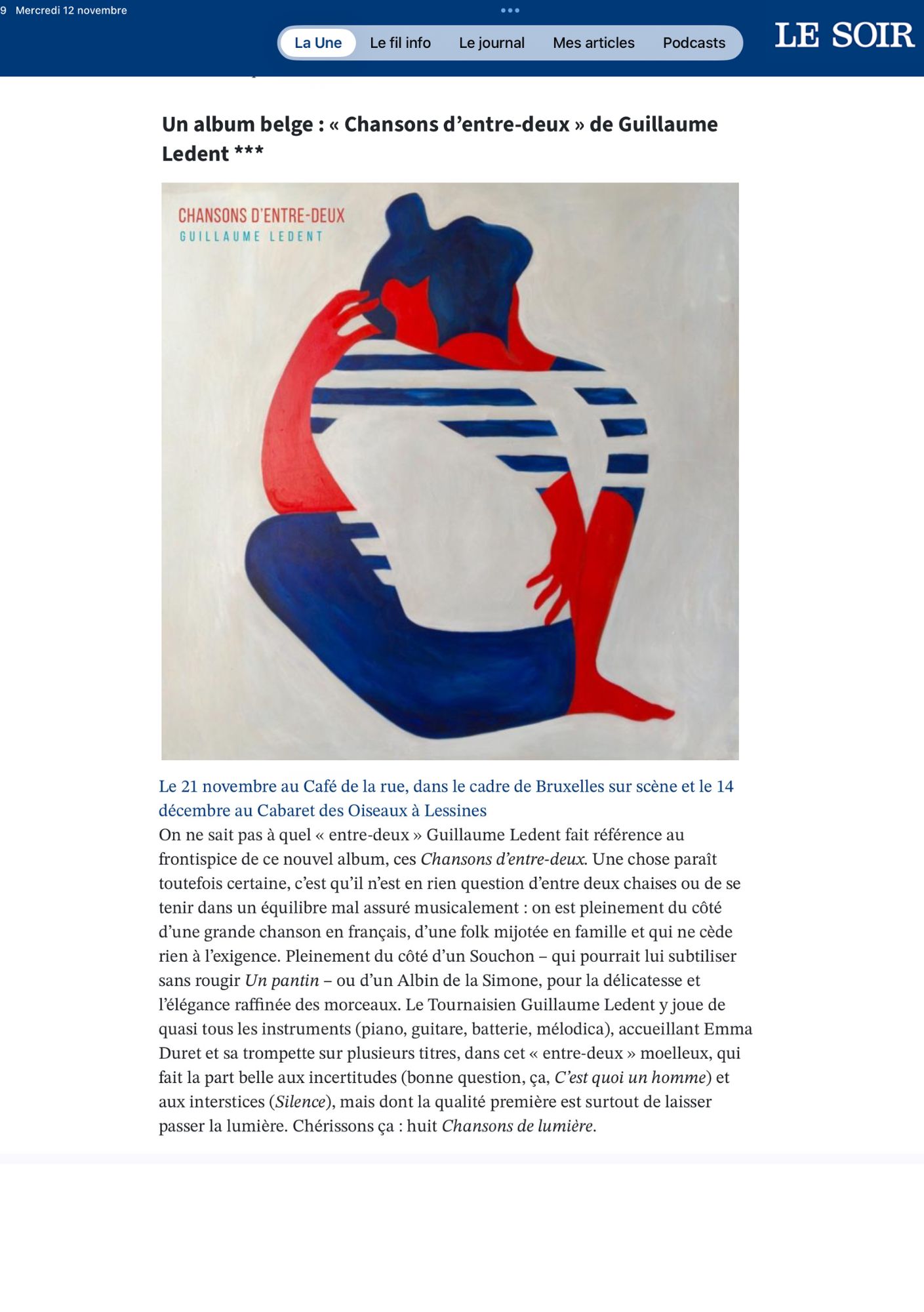 En effet, Chansons d’Entre-Deux vient de recevoir la mention 3 étoiles dans LE SOIR se retrouvant dans la sélection des 4 albums de la semaine (avec notamment Orelsan & Gorillaz). Si vous avez l’abonnement au soir (et en ligne), vous pouvez le lire sur leur site. Sinon, je l’ai téléchargé et mis ici. On peut dire ce qu’on veut, une critique de disque, de spectacle, c’est comme un examen. Il y a la peur du jugement, tout ça, la peur de ne pas être compris, de ne pas être allé jusqu’au bout de ce qu’on voulait proposer. Alors, quand d’une part la chronique est joliment écrite et qu’en plus le propos, l’intention de l’album ont été compris, c’est vraiment l’un des plus beaux retours que l’on puisse recevoir.